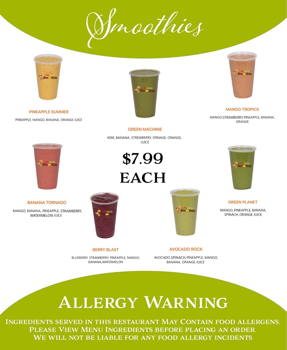 Welcome to Lifestyle Smoothie, a vibrant oasis located at 5430 N Henry Blvd, Stockbridge, GA. This charming smoothie cafe is dedicated to offering fresh, wholesome meals that are not only delicious but also health-conscious. Their extensive menu features an array of smoothies like the invigorating Berry Blast and refreshing Mango Tropics, each priced at just $11.99. Beyond smoothies, you can enjoy hearty options such as the Veggie Burger Combo for $19.99, made with organic ingredients daily.